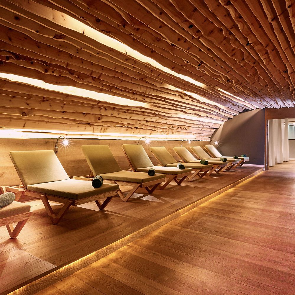 Nach dem Saunagang erwartet Sie eine Oase der Stille. Entspannen Sie in unseren hochwertig gestalteten Ruhezonen. Ein besonderes Highlight ist unser separater Zirben-Ruheraum, in dem Sie die Heilkraft der Tiroler Alpen hautnah spüren können.