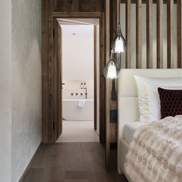- Gehackte Zirbe: Die haptische und optische Qualität des handwerklich bearbeiteten Holzes unterstreicht das luxuriöse Ambiente unserer Residences.