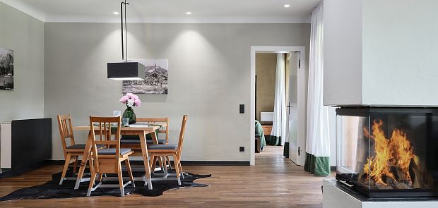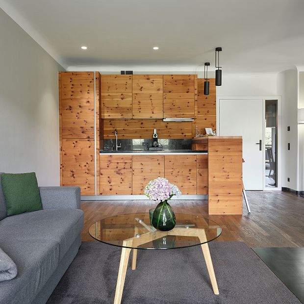 One bedroom, separate living room with fireplace and fully equipped open-plan kitchen; bathroom with steam shower and bathtub; loggia or terrace with majestic views of Kitzbühel's surrounding mountains.