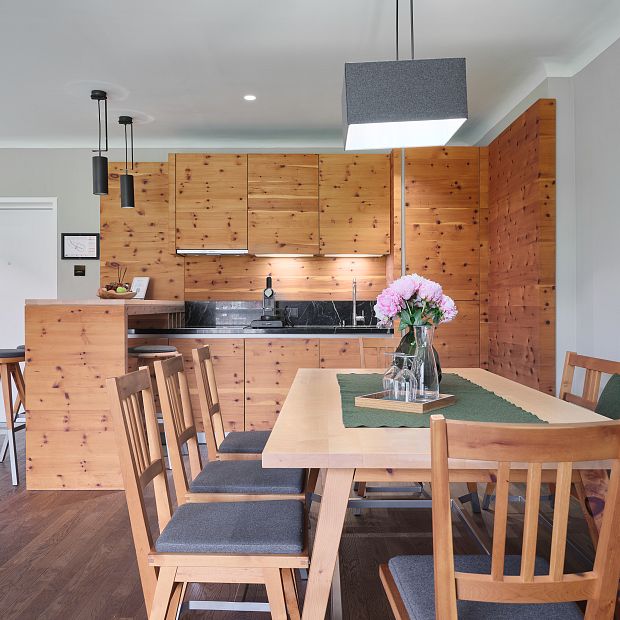This spacious Executive Suite encompasses around 110 m². In addition to the two bedrooms, the apartment comprises a beautifully furnished living room with fireplace and open-plan kitchen. Each of the two bathrooms features a bathtub and steam shower. The balcony offers stunning views of the Wilder Kaiser mountain.