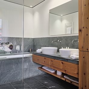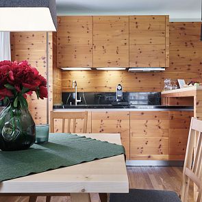 One bedroom, separate living room with open-plan, fully equipped kitchen, bathroom with steam shower and bathtub. Some suites feature a fireplace and a balcony.
